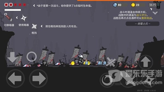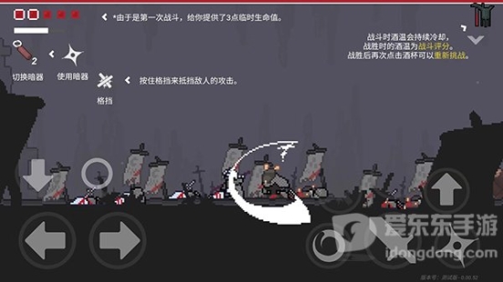 8、進入戰(zhàn)斗界面,可以使用普通攻擊和使用暗器來消滅敵人,也可以使用格擋來抵擋敵人的攻擊,左上角為生命值